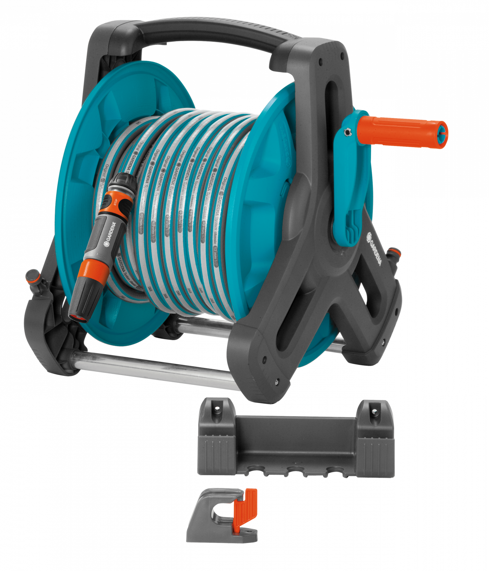 A tömlőtartó a tömlő falon történő tárolására szolgál, de bármikor leemelhető a mobil használathoz a kertben. Könnyen levehető a tartójáról, és ergonomikus markolatának köszönhetően kényelmesen hordozható.