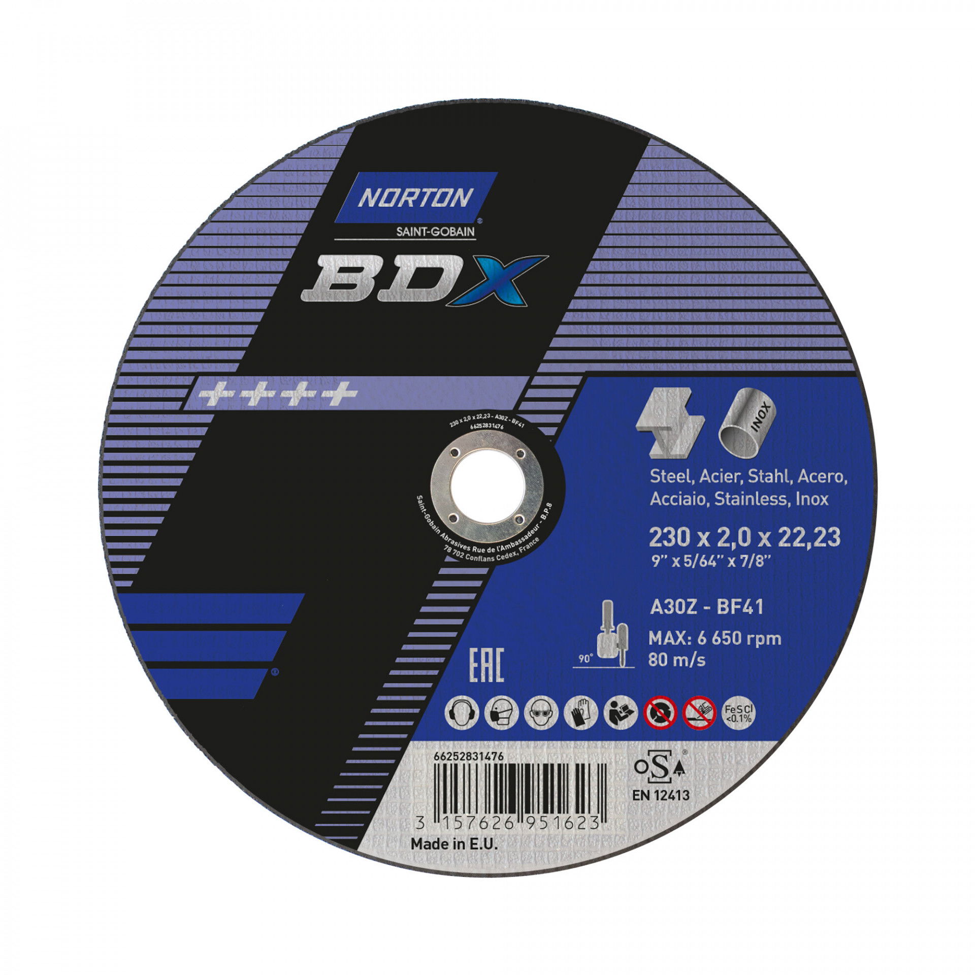 A Norton BDX fém-inox sorozat rendkívül vékony vágókorongokat kínál acél- és rozsdamentes acél széles választékához. A Norton BDX a költséghatékony vágókorongok szabványát állította be, amelyek hosszú élettartamot és gyorsabb fém eltávolítást biztosítanak az éles szilícium-karbid szemcséknek köszönhetően. Max.vágási sebesség : 80 m/s. Vas, kén és klór mentes. Nincs szennyeződés. Kevesebb rezgés.